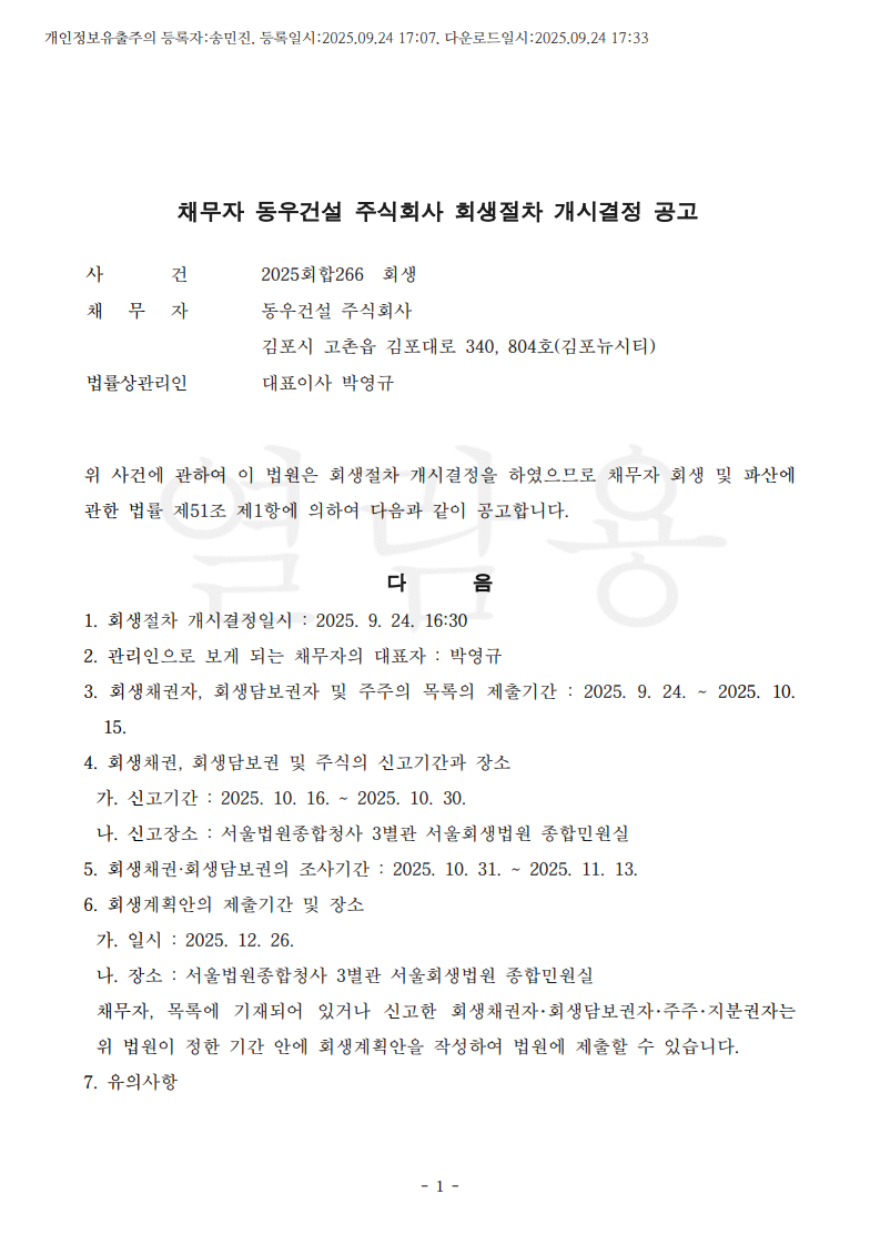 채무자 동우건설 주식회사 회생절자 개시결정 공고
